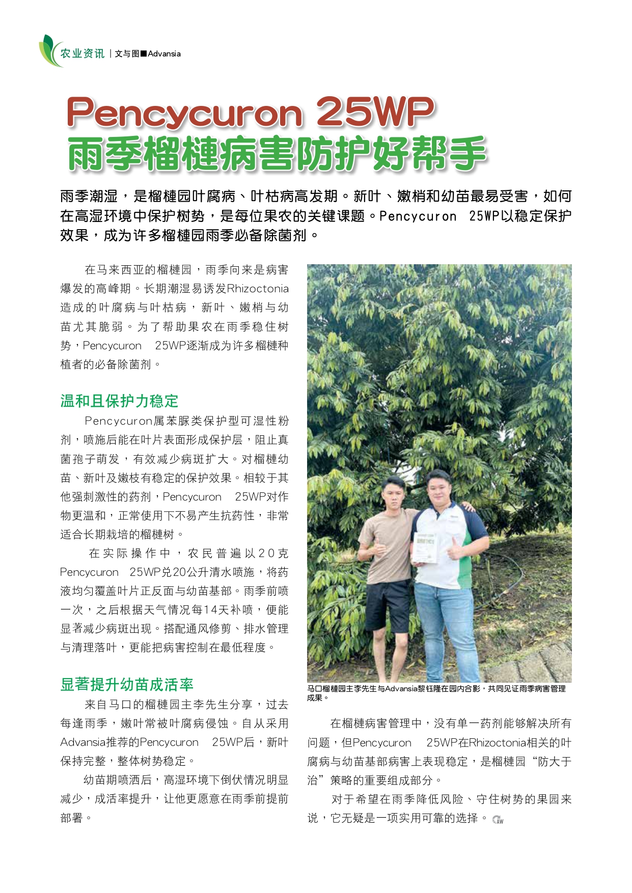 As Rhizoctonia rot becomes a critical threat in durian orchards—especially during wet months when new shoots and seedlings are most vulnerable—Pencycuron 25WP emerges as a stable, protective fungicide trusted by many Malaysian growers. Field application proves its strength in preventing leaf wilt and stem rot, with improved seedling survival rates and long-lasting protection, even under high-moisture conditions.